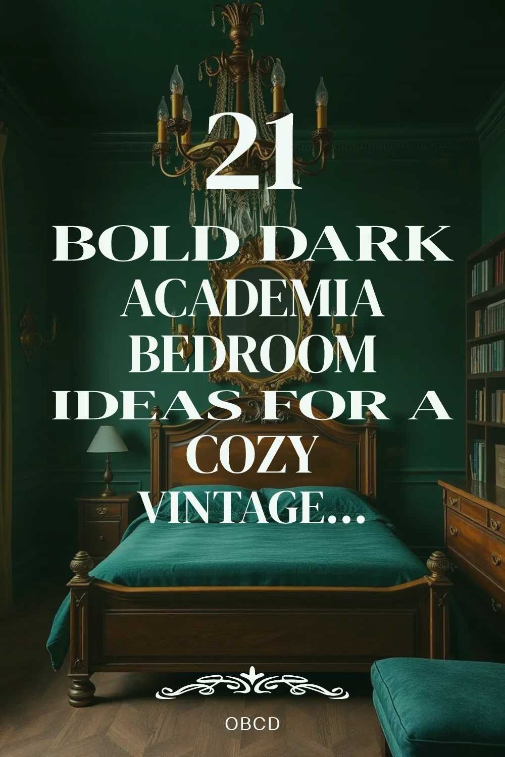 Dark academia bedroom with forest green walls, brass chandelier, and antique oak bed frame with velvet duvet
