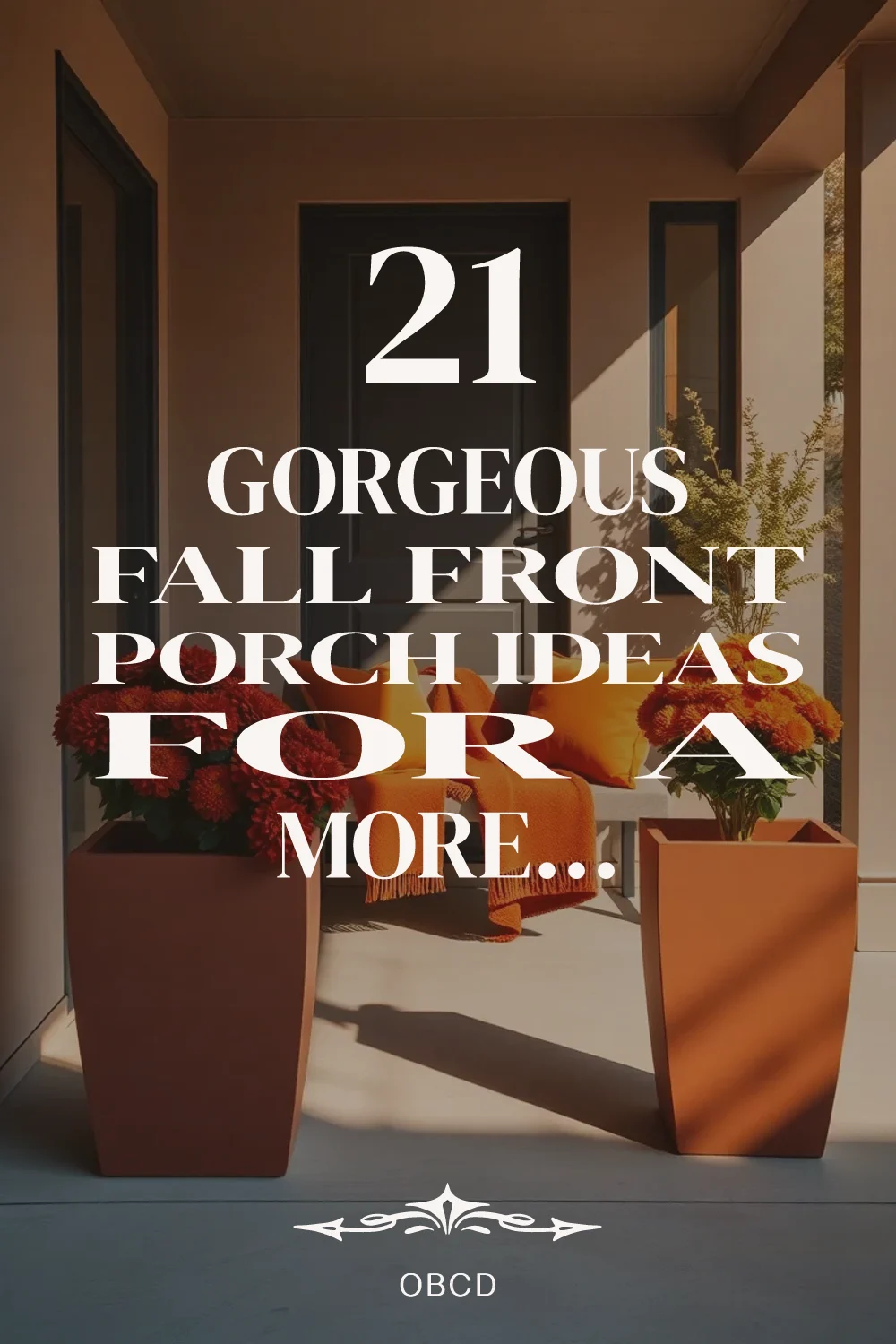 Hyper-realistic wide shot of a modern front porch with monochromatic burnt orange fall decor. Two large rectangular planters in matte terracotta contain mums in varying orange tones: deep rust pumpkin mums, amber chrysanthemums, and terra cotta fall flowers. A burnt orange wool throw drapes over a modern bench, with accent pillows in velvet rust and smooth terracotta. Porch floor is polished concrete. Front door is charcoal gray. Soft golden afternoon light creates long shadows. Minimalist architectural details. No text, no logos, no watermarks.</p>
