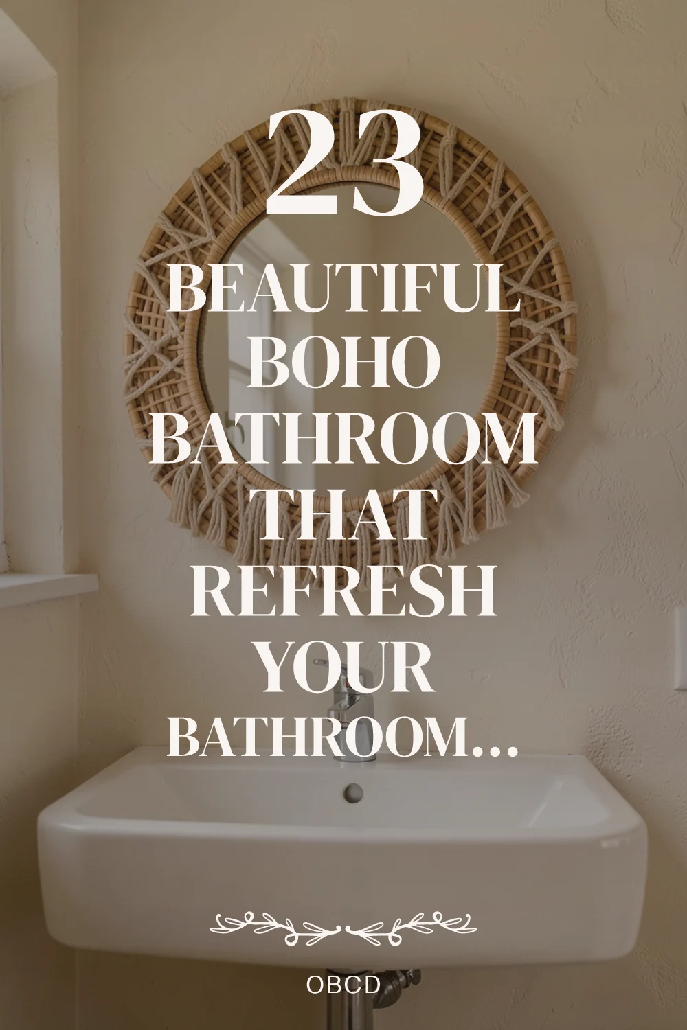 Boho bathroom ideas bring warmth and personality to any space — from a tiny rental powder room to a full master bath — without requiring permanent changes or a big budget.. Round rattan mirror with macramé rope frame above a white ceramic vanity sink in a boho bathroom with cream plaster walls and warm natural light